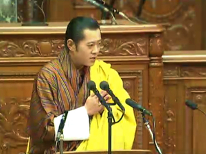 ブータン国王: 天皇皇后両陛下、日本国民と皆さまに深い敬意を表しますとともにこのたび日本国国会で演説する機会を賜りましたことを謹んでお受けします。衆議院議長閣下、参議院議長閣下、内閣総理大臣閣下、国会議員の皆様、ご列席の皆様。世界史においてかくも傑出し、重要性を持つ機関である日本国国会のなかで、私は偉大なる叡智、経験および功績を持つ皆様の前に、ひとりの若者として立っております。皆様のお役に立てるようなことを私の口から多くを申しあげられるとは思いません。それどころか、この歴史的瞬間から多くを得ようとしているのは私のほうです。このことに対し、感謝いたします。