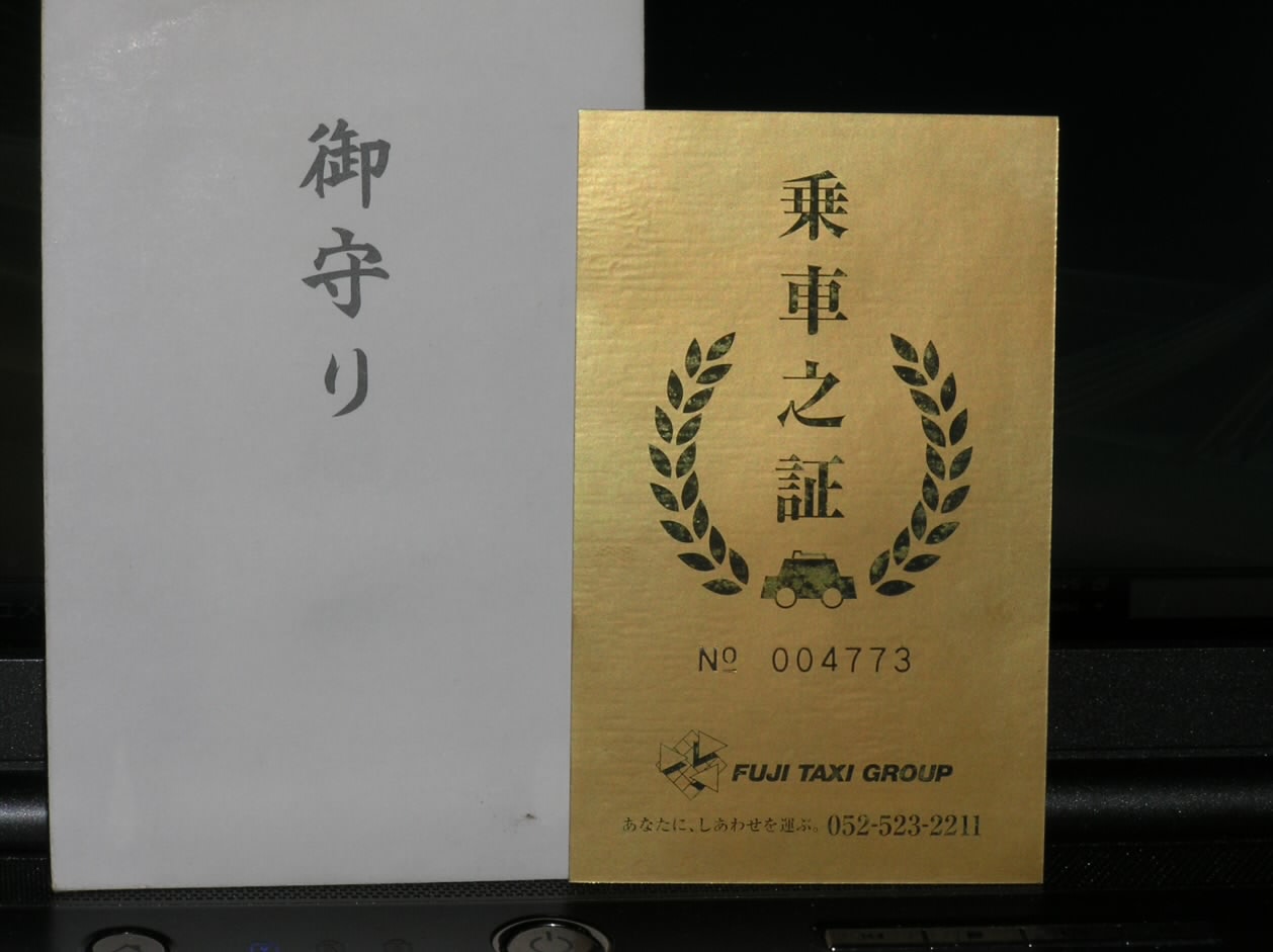 この金のタクシーに乗った人には、「乗車の証」なるお守りがもれなくドライバーさんから手渡されます。