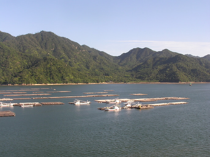 牡蠣の養殖棚がいくつも見える。