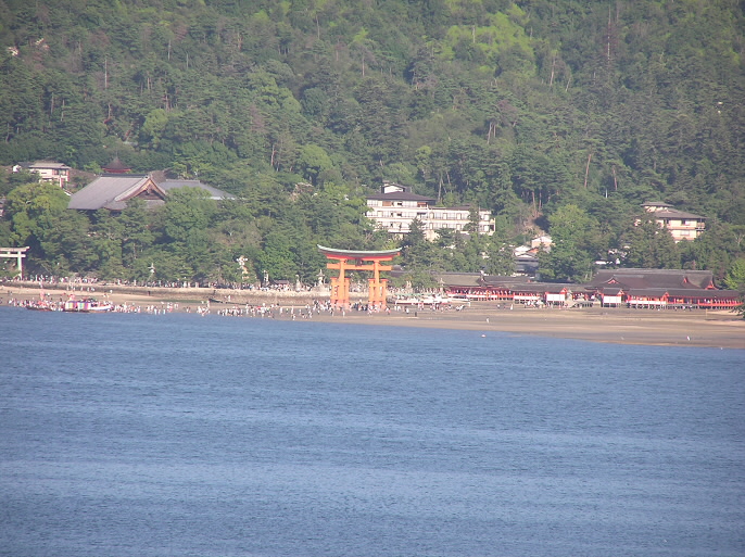 対岸は厳島神社の朱の鳥居が見える。