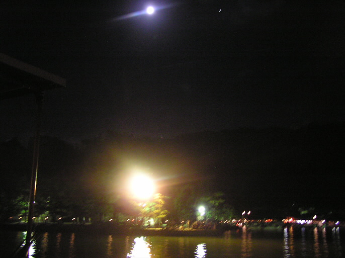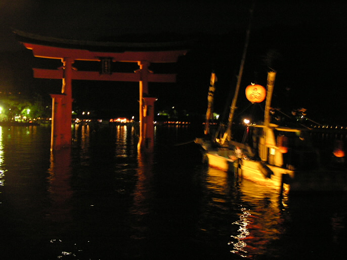 本当は辺りは真っ暗で、朱の鳥居のライトアップだけのはずなんだけど、今日は水面にたくさんの